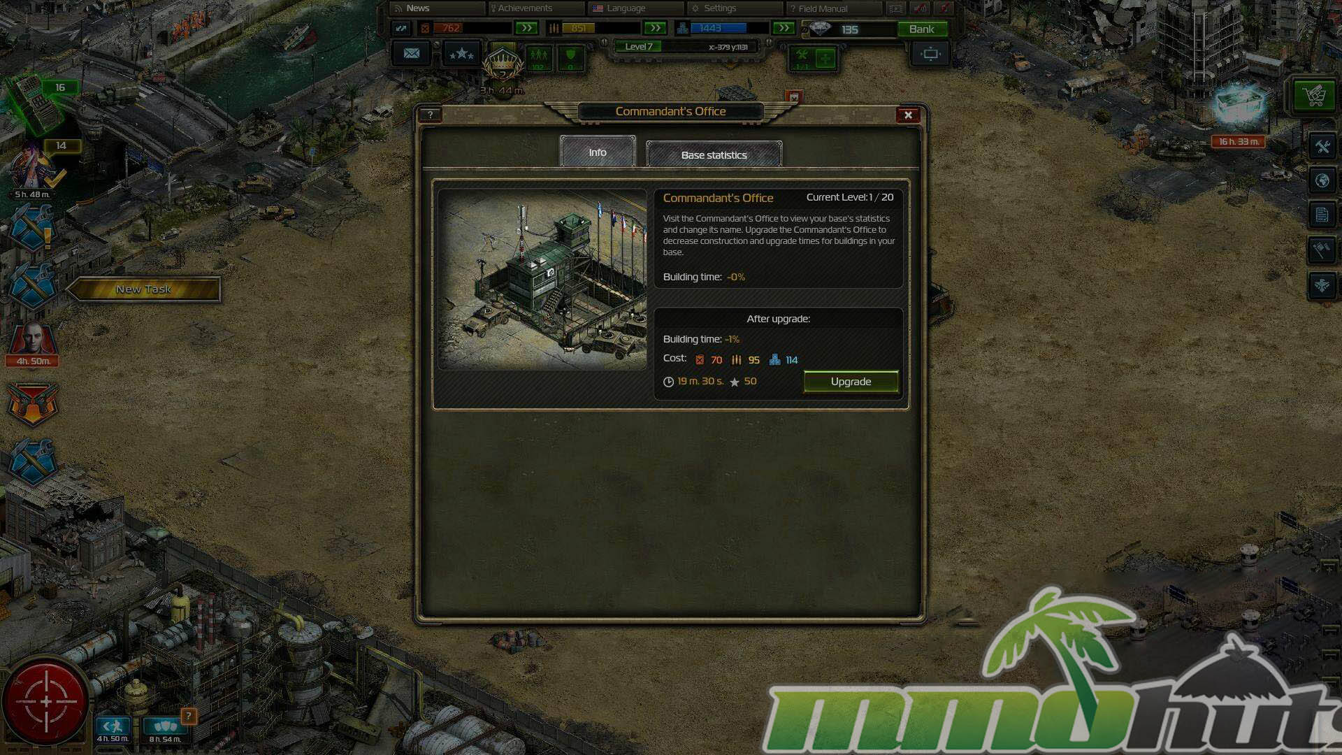 Most of your time is spent managing your headquarters. Buildings are the backbone of progression, providing production, unlocking new systems, and defining how quickly you can field troops. Construction options are organized by categories in the build interface, including Resource, Command, Military, Defense, Improvements, and Expansion. The game steadily nudges you to create a well-rounded base because key mechanics are gated behind specific structures.