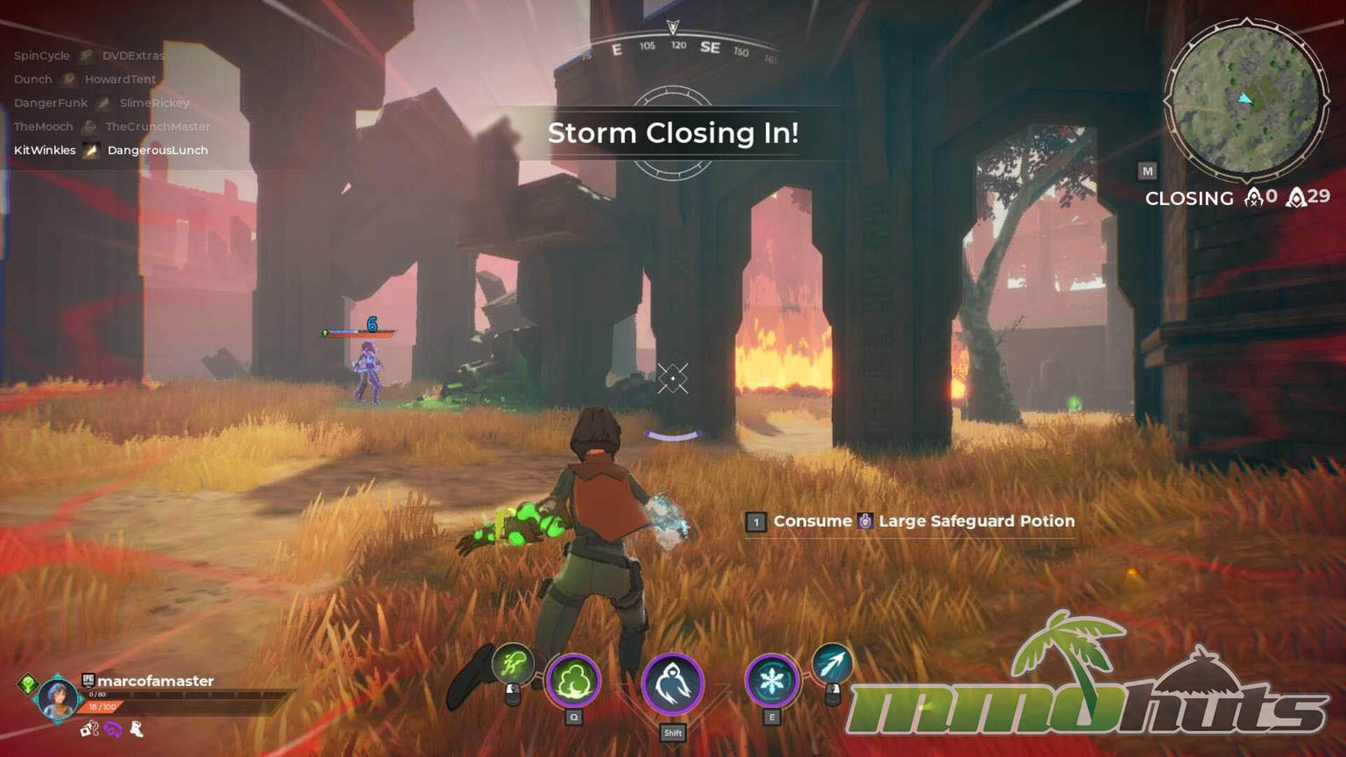 Runes added another layer by granting special abilities, for example stealth, extended gliding, short-range teleportation, and similar utility tools that helped with both escapes and aggressive pushes. Talents expanded over time through character progression, while Runes improved automatically as a match progressed, keeping the focus on moment-to-moment scavenging and smart engagements rather than micromanaging upgrades. As with most battle royales, a shrinking storm forced rotations and kept the pace from stalling, pushing players into contested areas as the endgame approached.