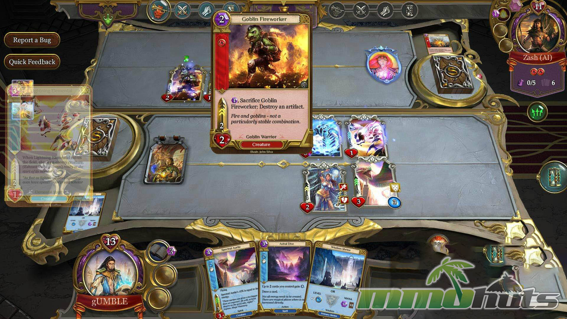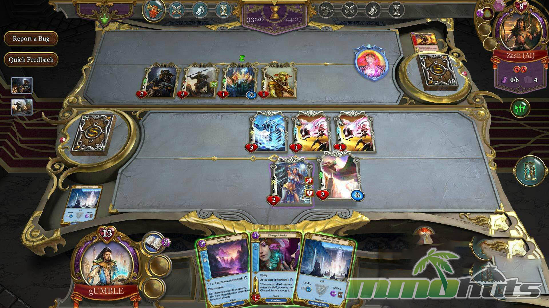 Visually, the battlefield presentation is clean and readable. Card text is easy to check via mouse-over, and the turn flow is reinforced by a phase bar along the top so you always know what step you are in. The game also uses turn timers with separate clocks for each player, which helps keep matches moving and limits overly slow play.