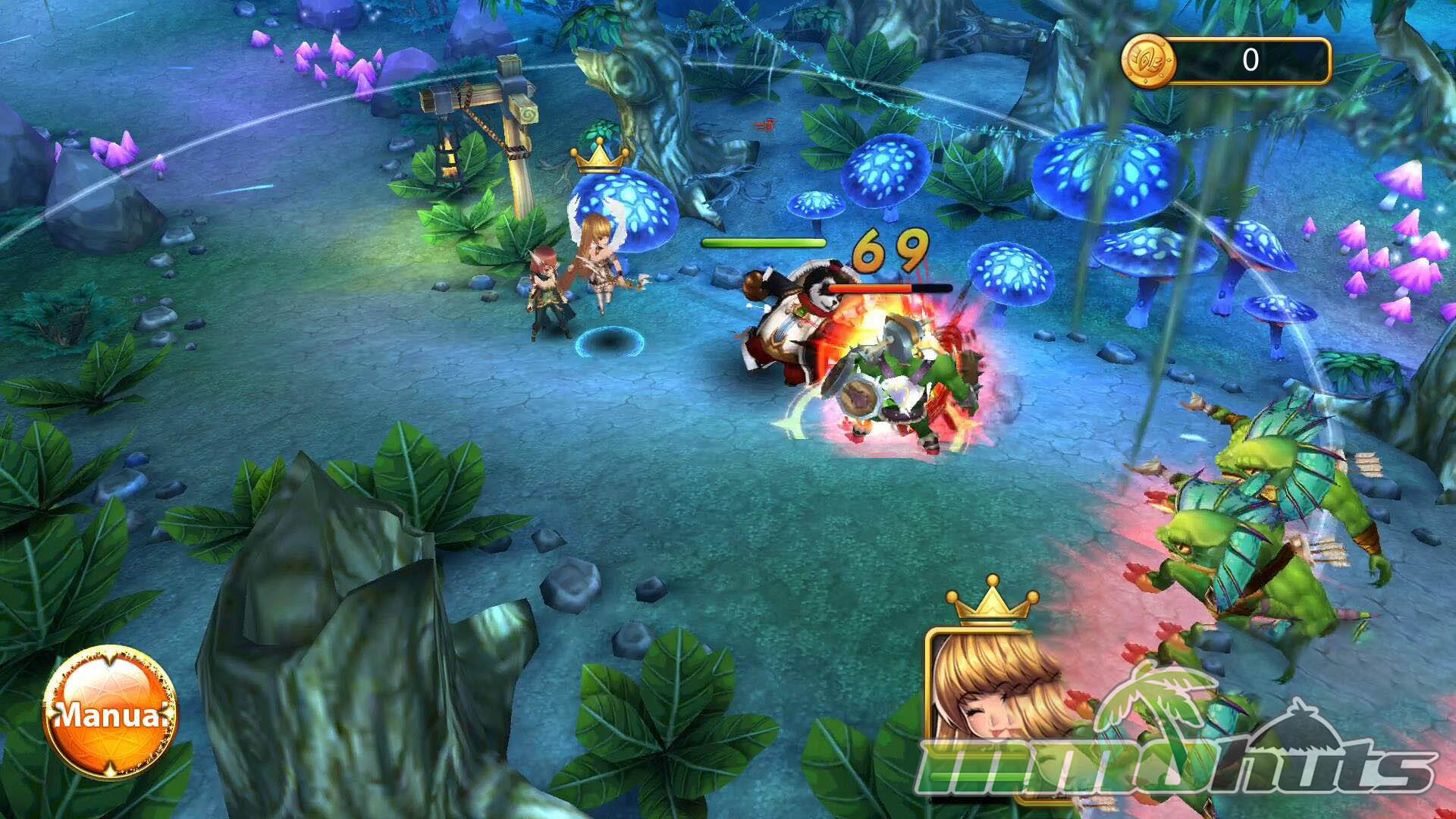 The game’s structure was straightforward: each region was a map made up of individual stages, and each stage played out as a short run through a compact area with multiple enemy waves and a final boss. Most missions were designed to be finished quickly, which fit mobile sessions well, even if it made the adventure feel more like a checklist than an extended dungeon crawl.