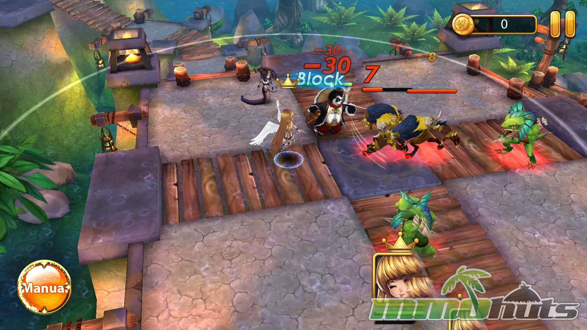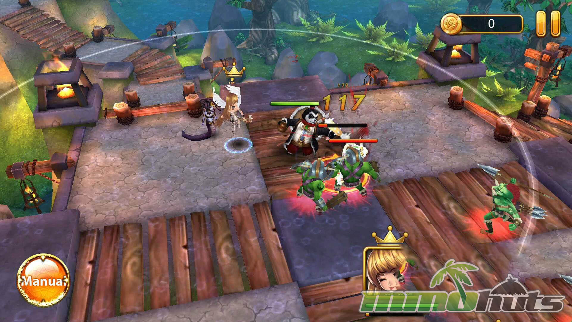 The game’s structure was straightforward: each region was a map made up of individual stages, and each stage played out as a short run through a compact area with multiple enemy waves and a final boss. Most missions were designed to be finished quickly, which fit mobile sessions well, even if it made the adventure feel more like a checklist than an extended dungeon crawl.