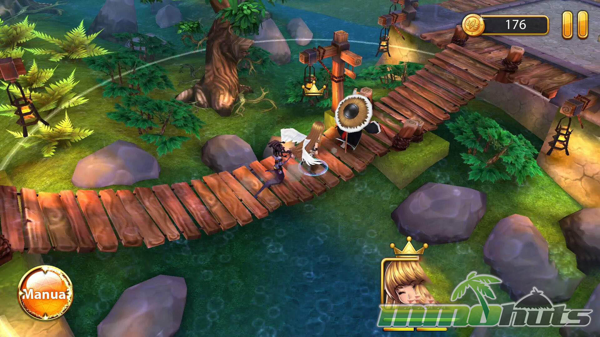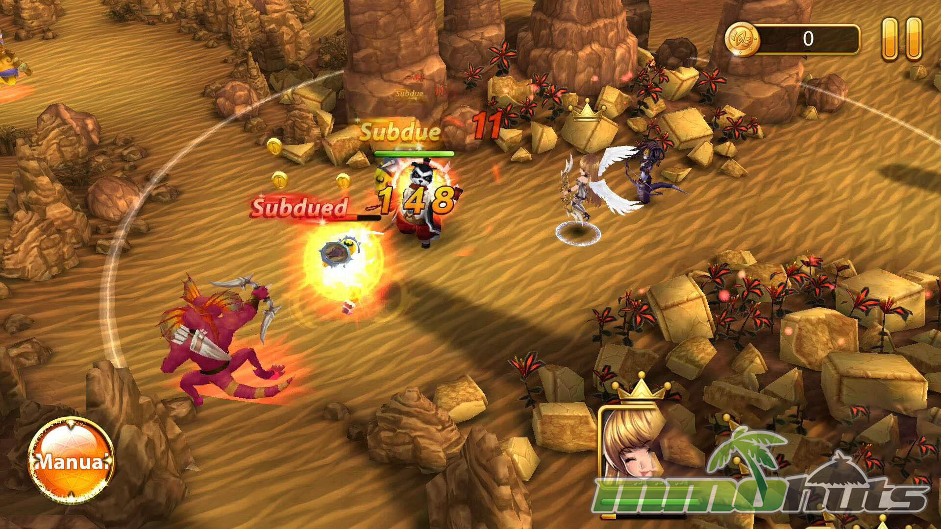 The game’s structure was straightforward: each region was a map made up of individual stages, and each stage played out as a short run through a compact area with multiple enemy waves and a final boss. Most missions were designed to be finished quickly, which fit mobile sessions well, even if it made the adventure feel more like a checklist than an extended dungeon crawl.