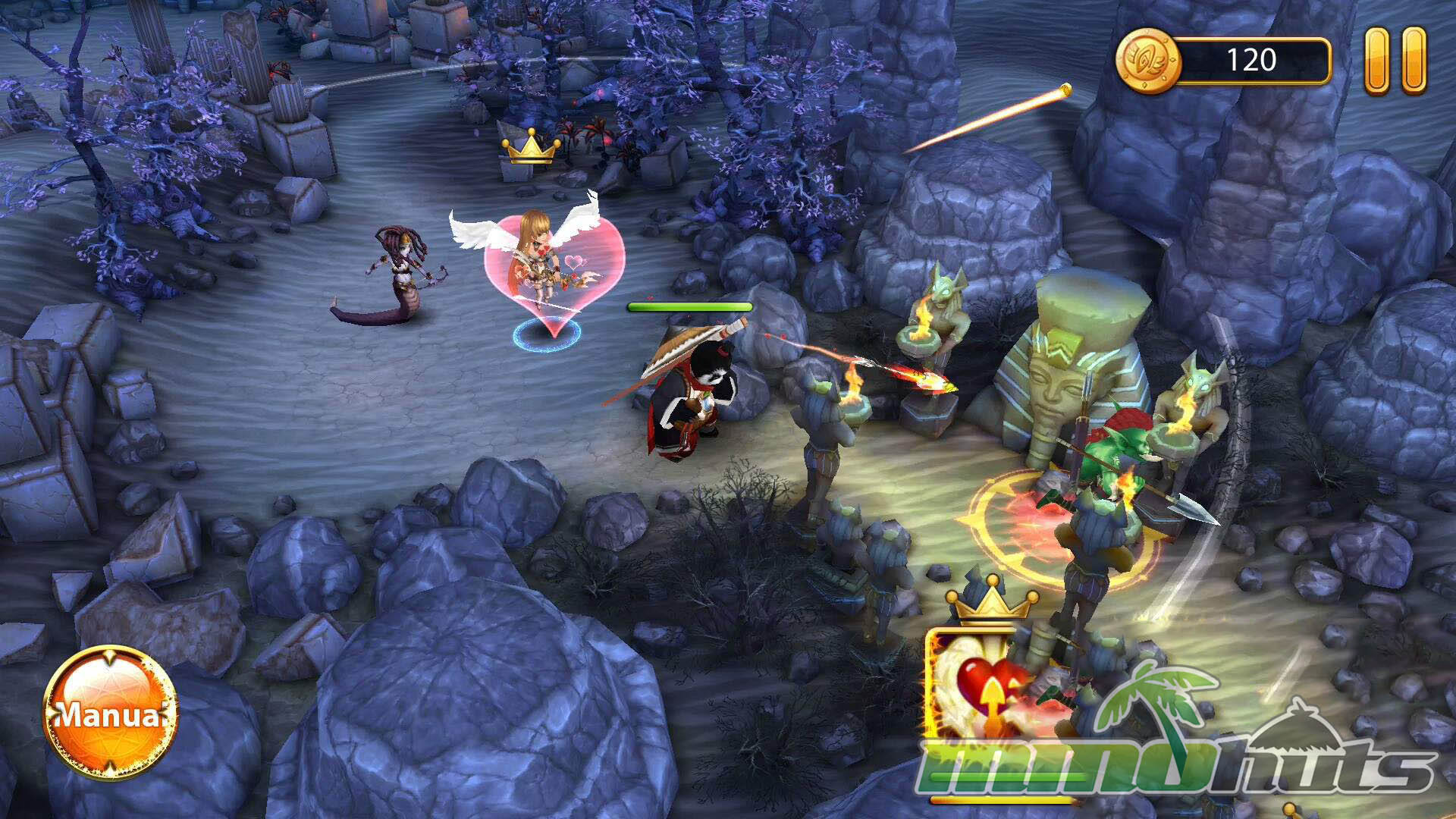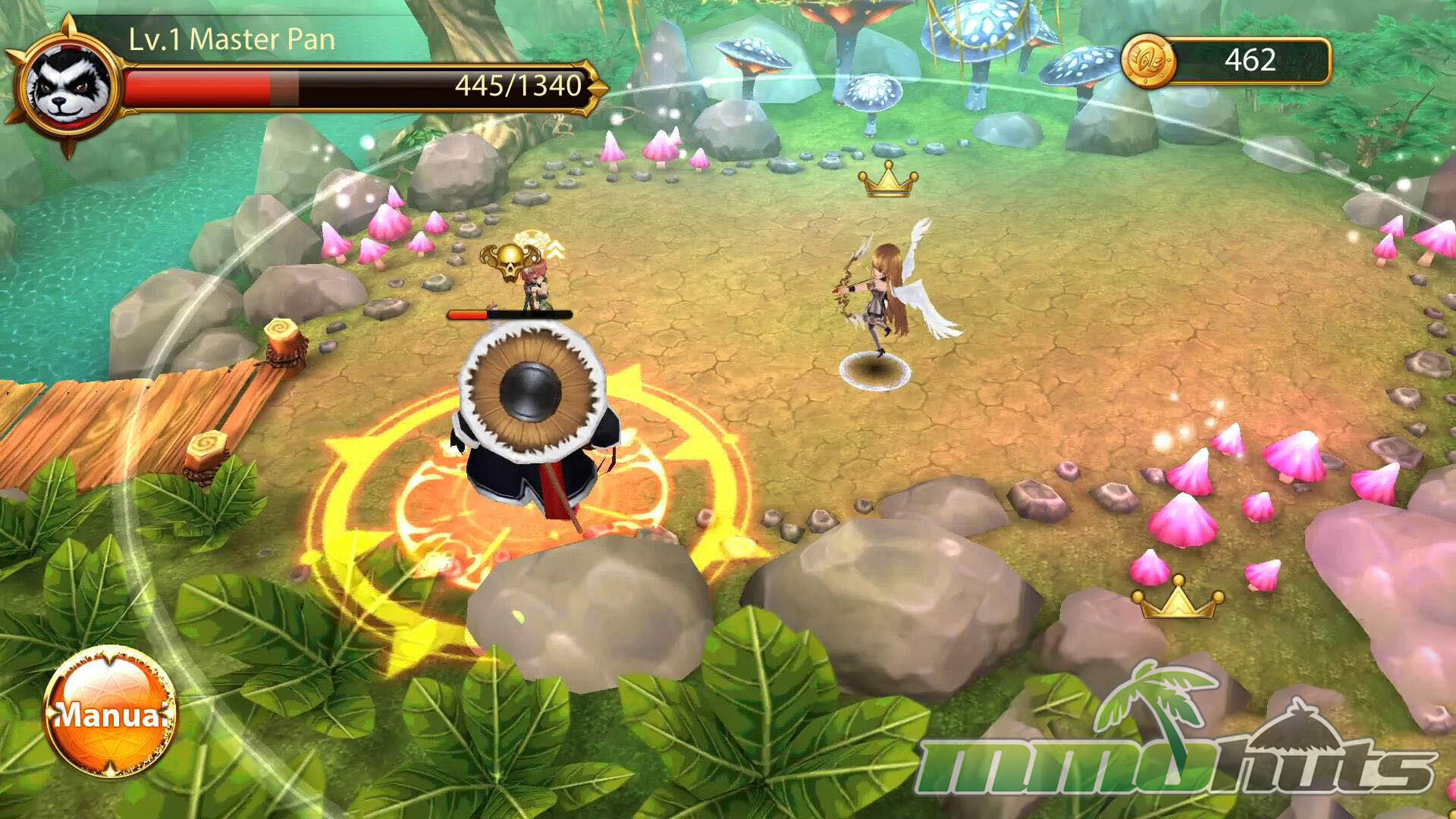 The game’s structure was straightforward: each region was a map made up of individual stages, and each stage played out as a short run through a compact area with multiple enemy waves and a final boss. Most missions were designed to be finished quickly, which fit mobile sessions well, even if it made the adventure feel more like a checklist than an extended dungeon crawl.