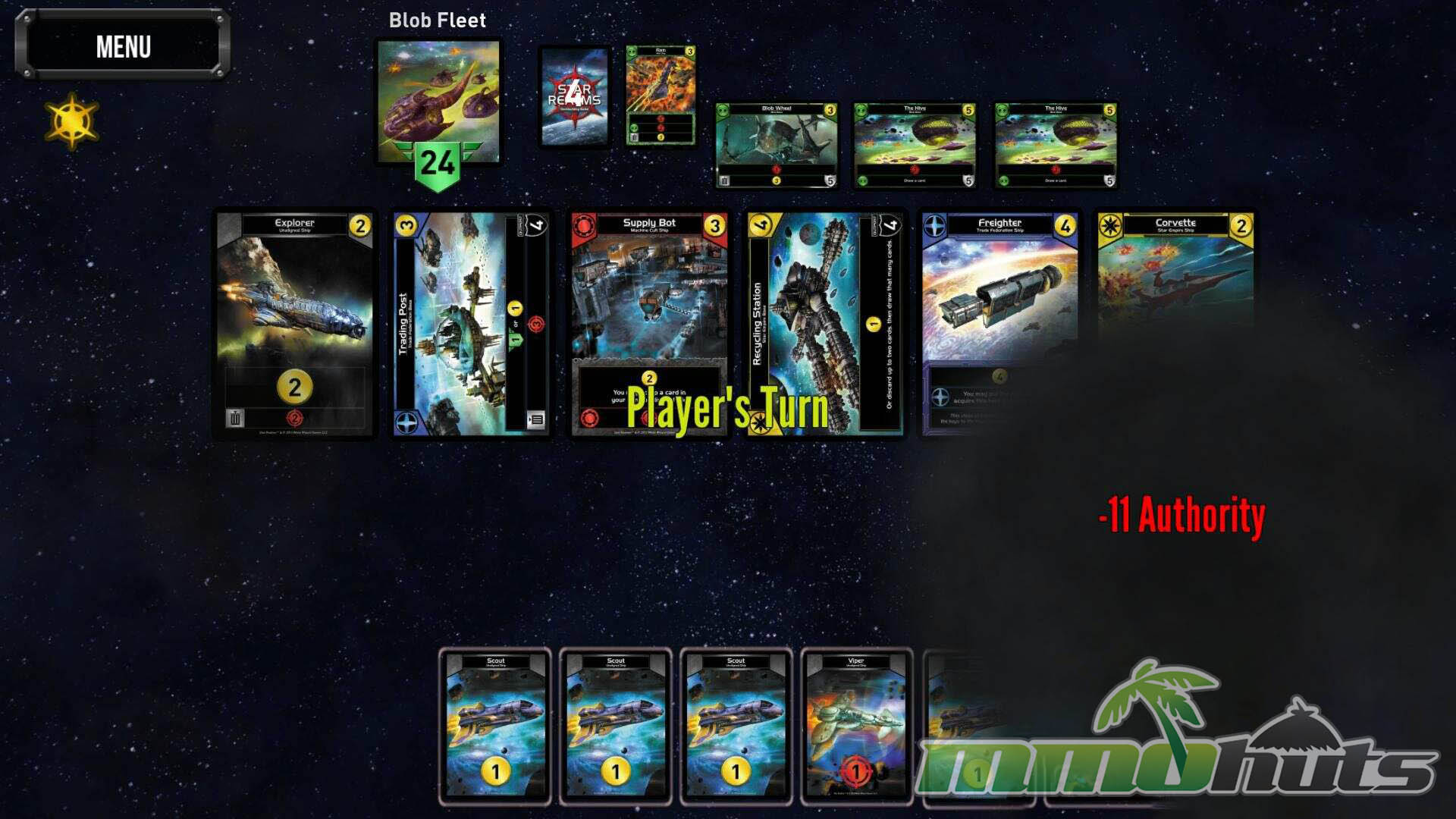 Each game revolves around three main numbers that constantly pull your decisions in different directions. Trade is your economy for acquiring new ships and bases, Combat is your damage output, and Authority is your life total that you are trying to defend while reducing your opponent’s to zero. On your turn you play what you draw, generate Trade and Combat, and decide whether to spend resources on immediate pressure, long-term value, or defensive bases that can soak damage and create board-like friction.