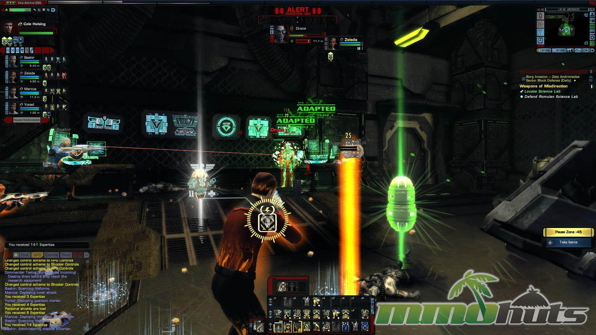 STO includes PvP through queues in the Mission Journal, supporting both ground and space formats. War Zones are built as larger, continuous maps where faction conflict overlaps with threats like the Borg, creating a more chaotic, ongoing battle environment. In ground War Zones, teams attempt objectives while also watching for opposing players doing the same.