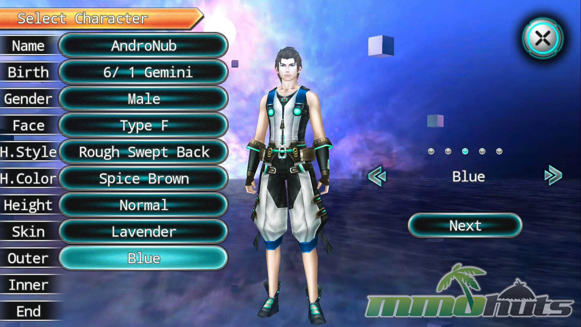 The opening character creator offers more control than many mobile MMORPGs from the same era. You pick a gender, then fine-tune the look with multiple face and hairstyle choices, a range of hair colors, and adjustments such as height and skin tone. Even the starting outfit has color customization, which helps new characters avoid looking identical in crowded hubs.