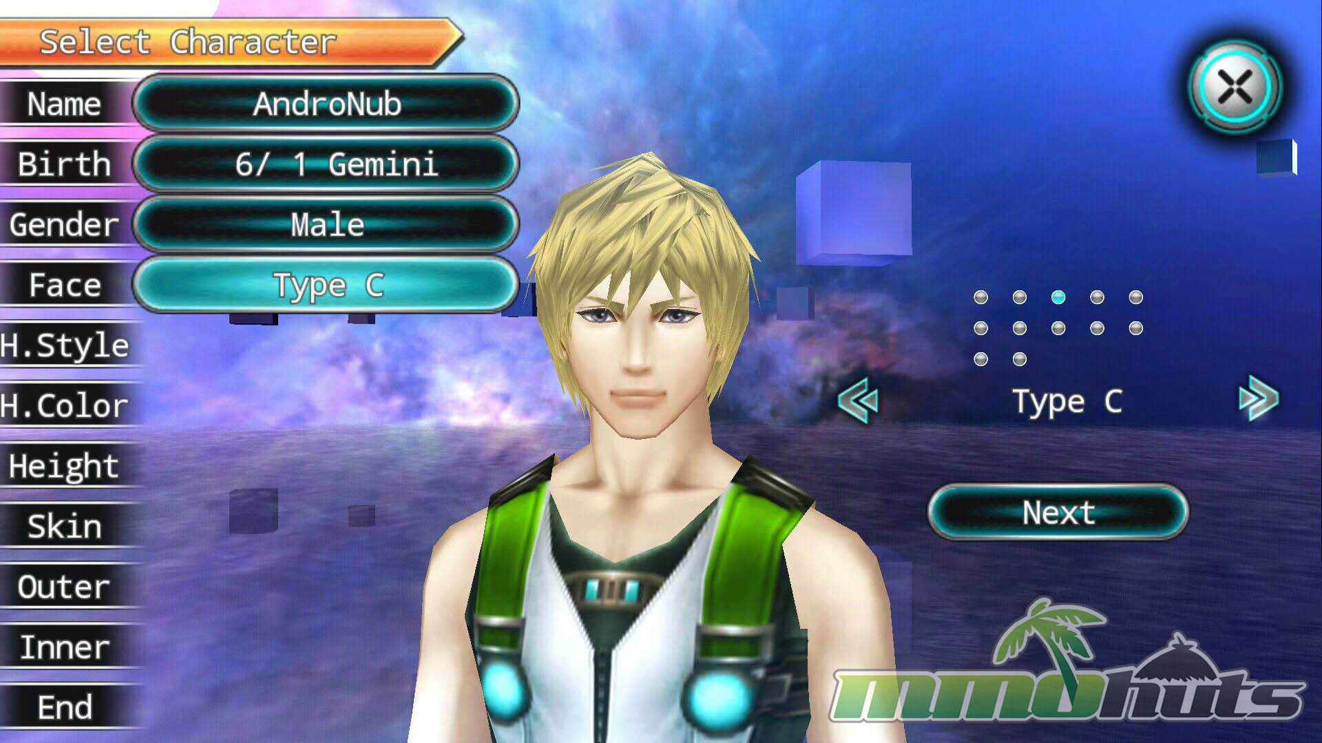 The opening character creator offers more control than many mobile MMORPGs from the same era. You pick a gender, then fine-tune the look with multiple face and hairstyle choices, a range of hair colors, and adjustments such as height and skin tone. Even the starting outfit has color customization, which helps new characters avoid looking identical in crowded hubs.