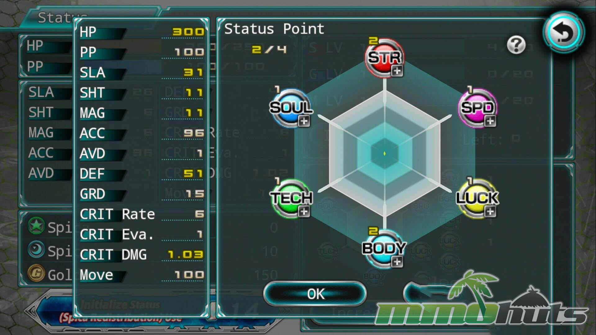 Beyond weapon skills, progression includes S/G/M Level and traditional status point allocation. By defeating monsters you earn Star Spicas, which are used to invest toward S/G/M upgrades. The S Level strengthens Blade, Glaive, Vice, and Ranger weapons, the G Level strengthens Blaster, Launcher, Chaser, and Vice weapons, and the M Level strengthens Sphere, Ranger, and Chaser weapons. These levels only increase after you have allocated twenty points into one track, so advancement is gradual and encourages longer-term planning rather than constant respec behavior.