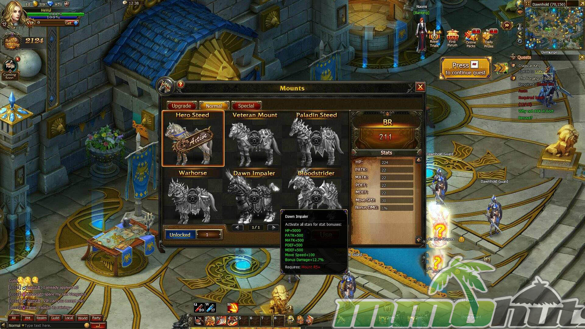 Stormthrone’s store sells a familiar set of power-adjacent items: mount progression materials, mount variants, cloak upgrades, and timed boosts for experience and gold. The premium currency, Pyrum, can be purchased with real money or obtained through gameplay. Spending also feeds into a VIP system that scales benefits based on how much currency you buy, offering convenience and progression advantages.