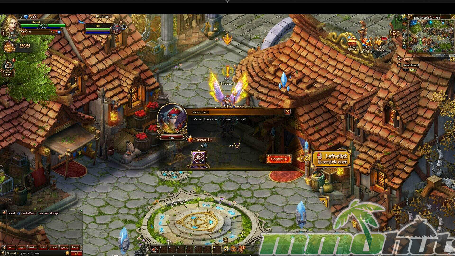 Alongside the introductory quests, the game pushes long-term incentive systems early: timed play rewards, daily log-in bonuses, and compensation-style experience for missed activity windows. In practice, these mechanics are designed to keep players returning, and they also help smooth out leveling and early gearing for anyone playing consistently.