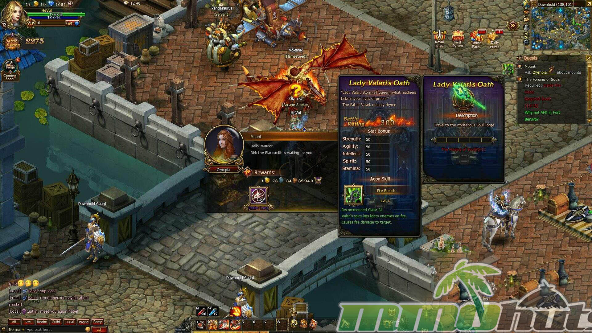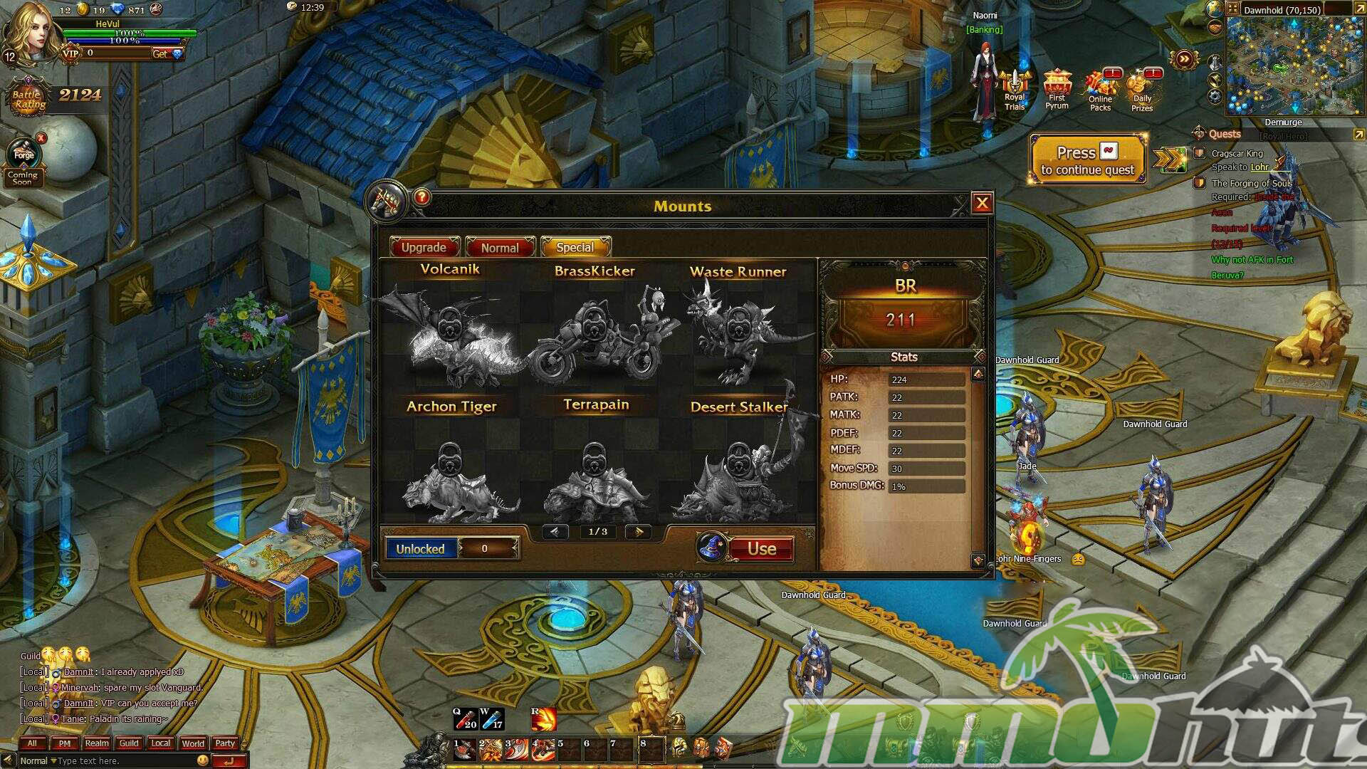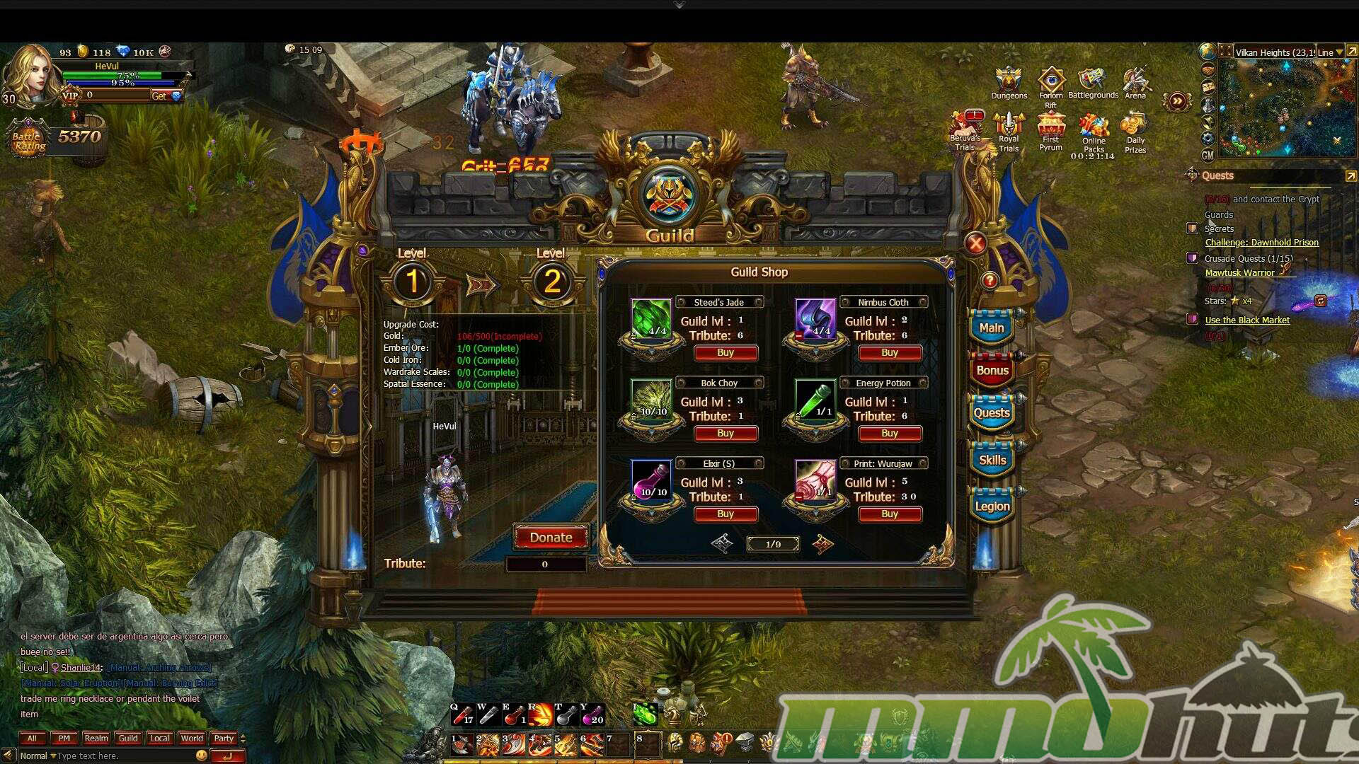 Stormthrone’s store sells a familiar set of power-adjacent items: mount progression materials, mount variants, cloak upgrades, and timed boosts for experience and gold. The premium currency, Pyrum, can be purchased with real money or obtained through gameplay. Spending also feeds into a VIP system that scales benefits based on how much currency you buy, offering convenience and progression advantages.