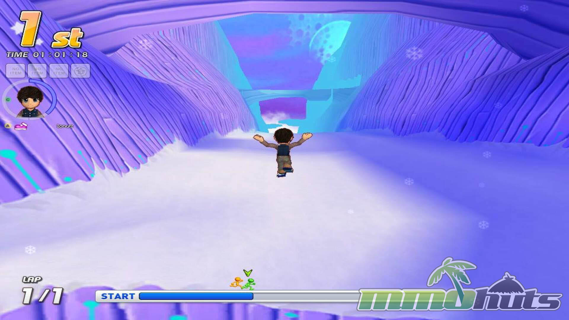 The co-op boss mode is another fun twist. Instead of racing other players, the group sprints together to stay ahead of a pursuing boss, turning the stage into a shared survival run. Movement is mostly on foot, but certain tracks add segments like skiing, rope climbing, or swimming to break up the rhythm.