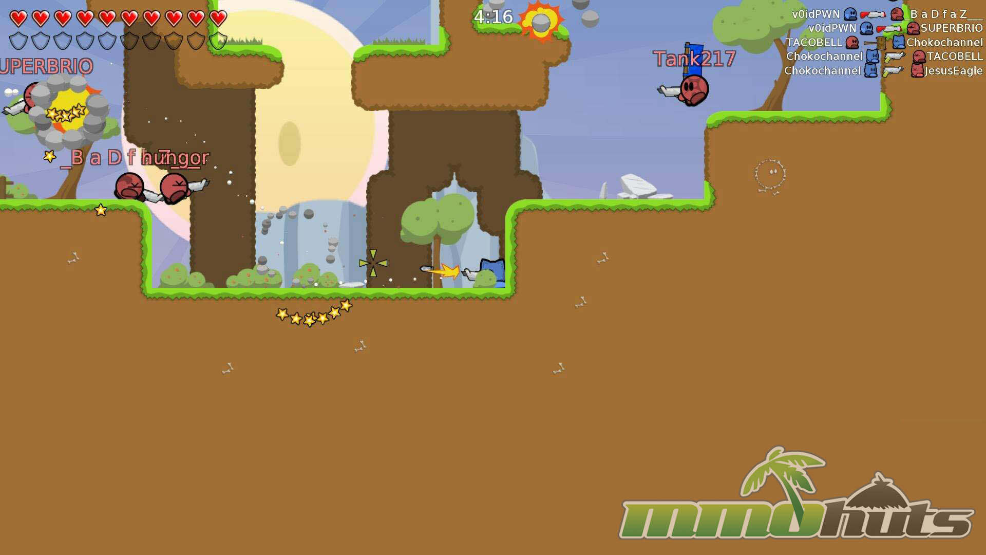 The art style helps here too. It is not trying to impress with technical detail, instead it keeps characters and effects legible when the screen is busy. Small touches like emotes and cosmetic sprite options add personality without distracting from competitive clarity. The overall vibe is light, but the gameplay itself rewards practice, especially movement mastery and weapon timing.