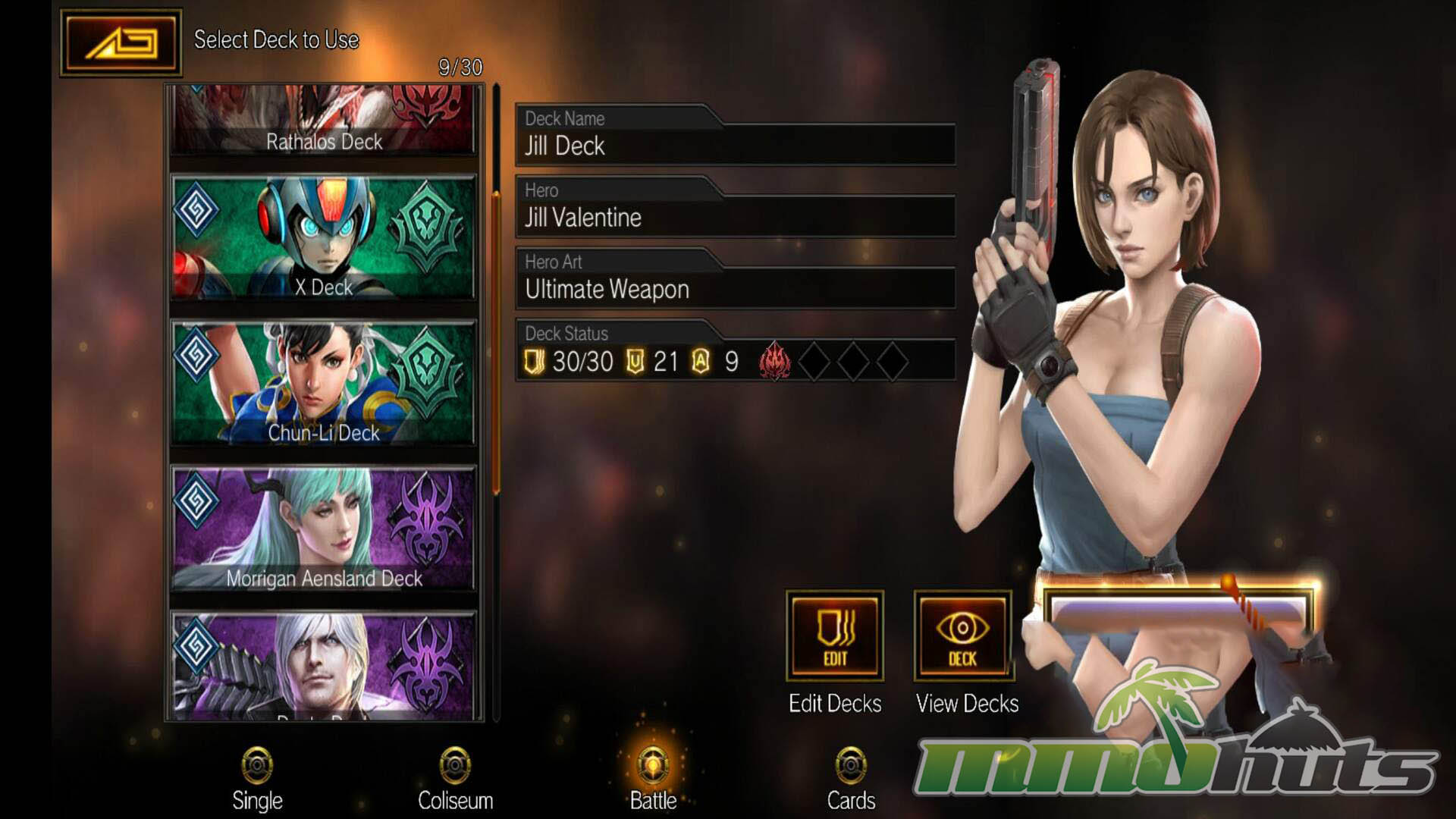 Deckbuilding is organized around four deck types, letting you lean toward different game plans depending on how you like to play. From there, you tune your list with cards representing characters and enemies pulled from across the Capcom catalog, giving the game a strong fan-service edge without losing the fundamentals of a competitive card game.