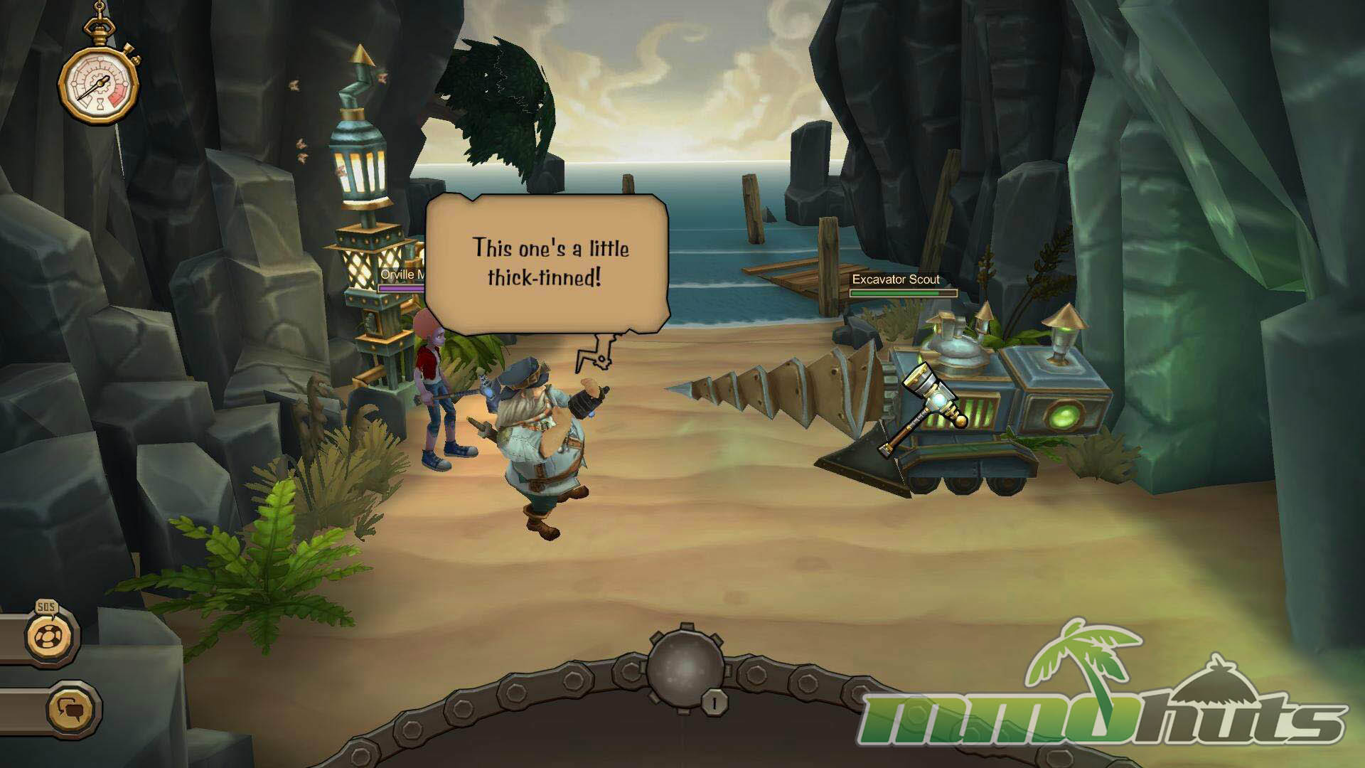 The steampunk presentation does a lot of the heavy lifting. Areas are bright and readable, enemy designs are more playful than threatening, and the world has a storybook quality that makes exploration feel safe and inviting. The writing leans into quirky personalities and gentle humor, which helps the game maintain momentum between objectives. It is not trying to be gritty or complex, it is trying to be welcoming.