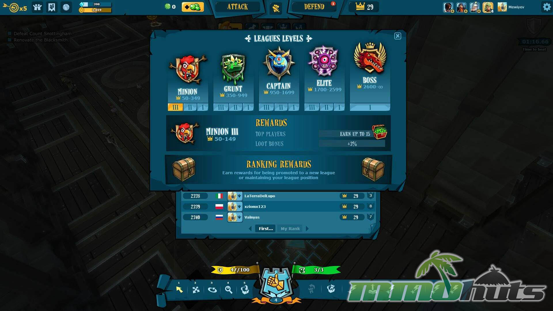 The long-term hook is the PvP ladder. Crowns determine rank, and the game organizes players into tiered leagues reminiscent of competitive ranking systems in other genres. Doing well brings daily rewards, and at higher levels those rewards can include Blings, which gives dedicated players a route to premium purchases without paying. The PvP loop is also social in small ways: after a raid you can rate and comment on the castle, and Clans provide a more organized channel for feedback and testing once you meet the level requirement to join one.