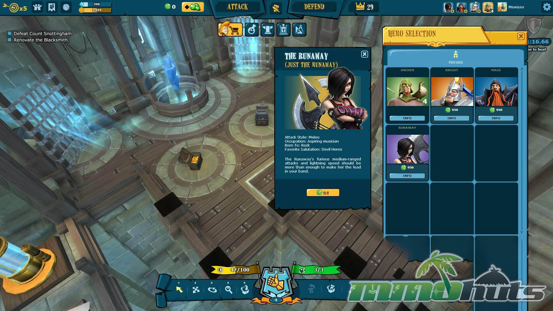 On the attacking side, you select a hero to start raiding. Beginners have access to the Knight and the Archer, while additional heroes are locked behind the premium currency, Blings. Once the basics are covered, the game pushes you toward a tougher NPC castle that acts as a gate to the next region, where higher payouts and new upgrade options make the loop feel more rewarding.