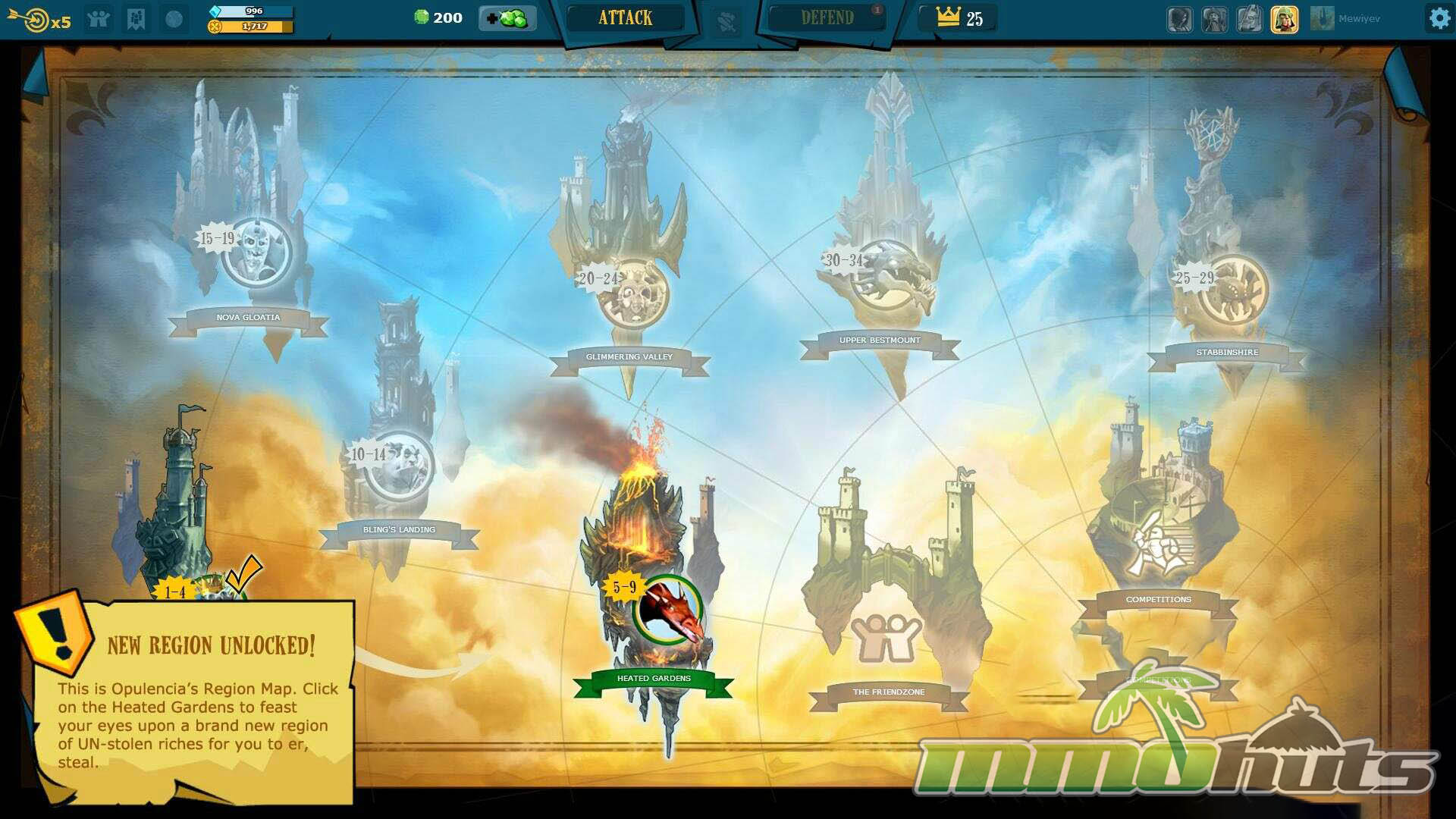 On the attacking side, you select a hero to start raiding. Beginners have access to the Knight and the Archer, while additional heroes are locked behind the premium currency, Blings. Once the basics are covered, the game pushes you toward a tougher NPC castle that acts as a gate to the next region, where higher payouts and new upgrade options make the loop feel more rewarding.