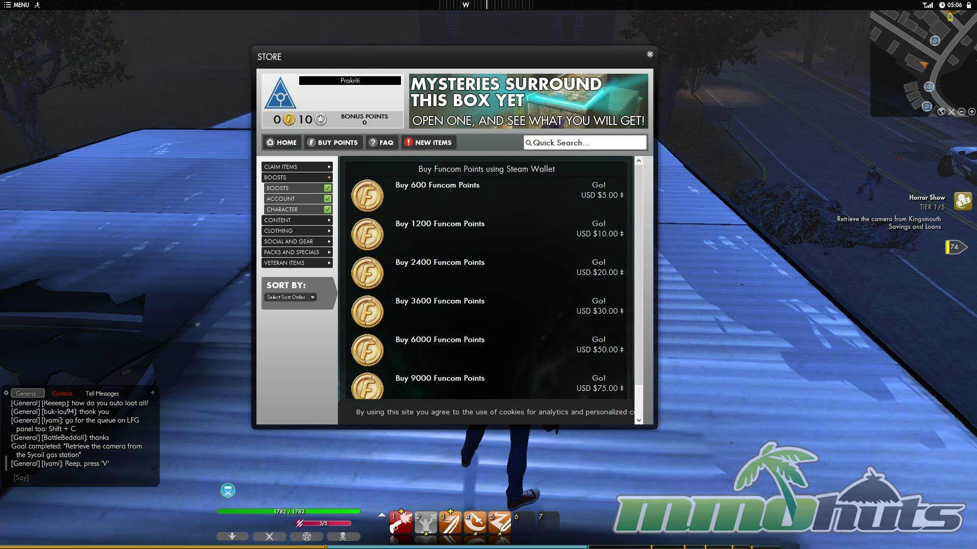 The Secret World includes a cash shop that mostly emphasizes cosmetics, with a handful of boosters for players who want to accelerate progress. Funcom points are the currency, with 600 points priced at $5. Many clothing and style items sit within reach of that amount, while some purchases, including boosters and higher-priced cosmetics, can cost more than 300 points and may require topping up.