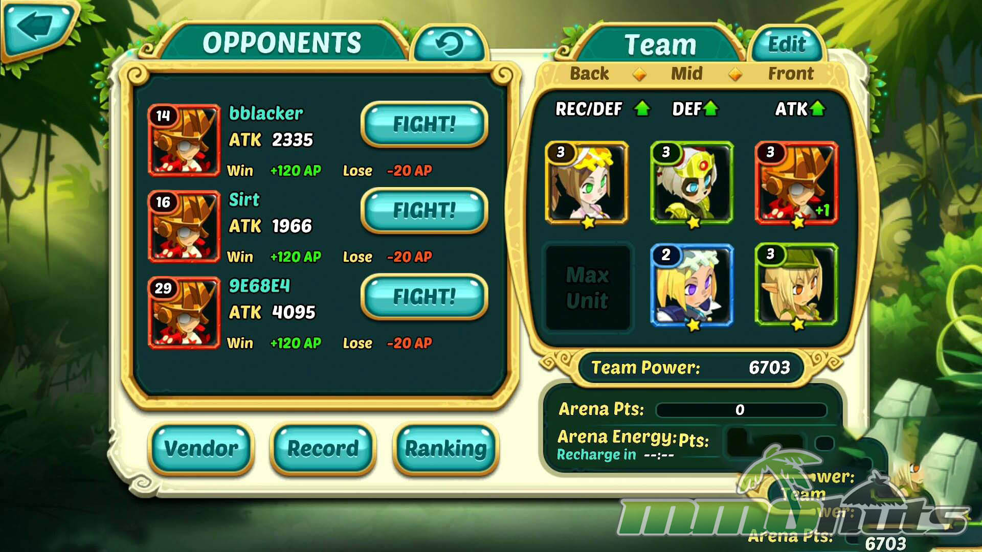 Outside the campaign, Wakfu Raiders offers two major side modes: Arena and Crypt. Arena functions as the game’s PVP feature, matching your party against other players’ teams. The drawback is that fights are fully automated, so you mainly watch the outcome rather than actively outplay an opponent. Elemental pattern triggers are turned off in PVP, and skill usage tends to be straightforward, which limits strategy beyond team composition and raw power. A ranking ladder and rewards do provide motivation, and Arena points can be exchanged for useful items like Hero Soul Shards and equipment, but matchmaking can be rough, often placing you against significantly stronger teams.
