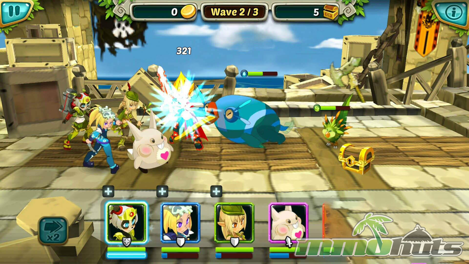 Wakfu Raiders includes over 100 stages spread across different environments with their own enemy sets. Team-building matters, as you field up to five Heroes and place them into a formation that influences their effectiveness. Front positions favor offense, middle slots emphasize defense, and back positions provide more defensive and recovery-oriented benefits, creating a simple but meaningful setup choice before a fight.