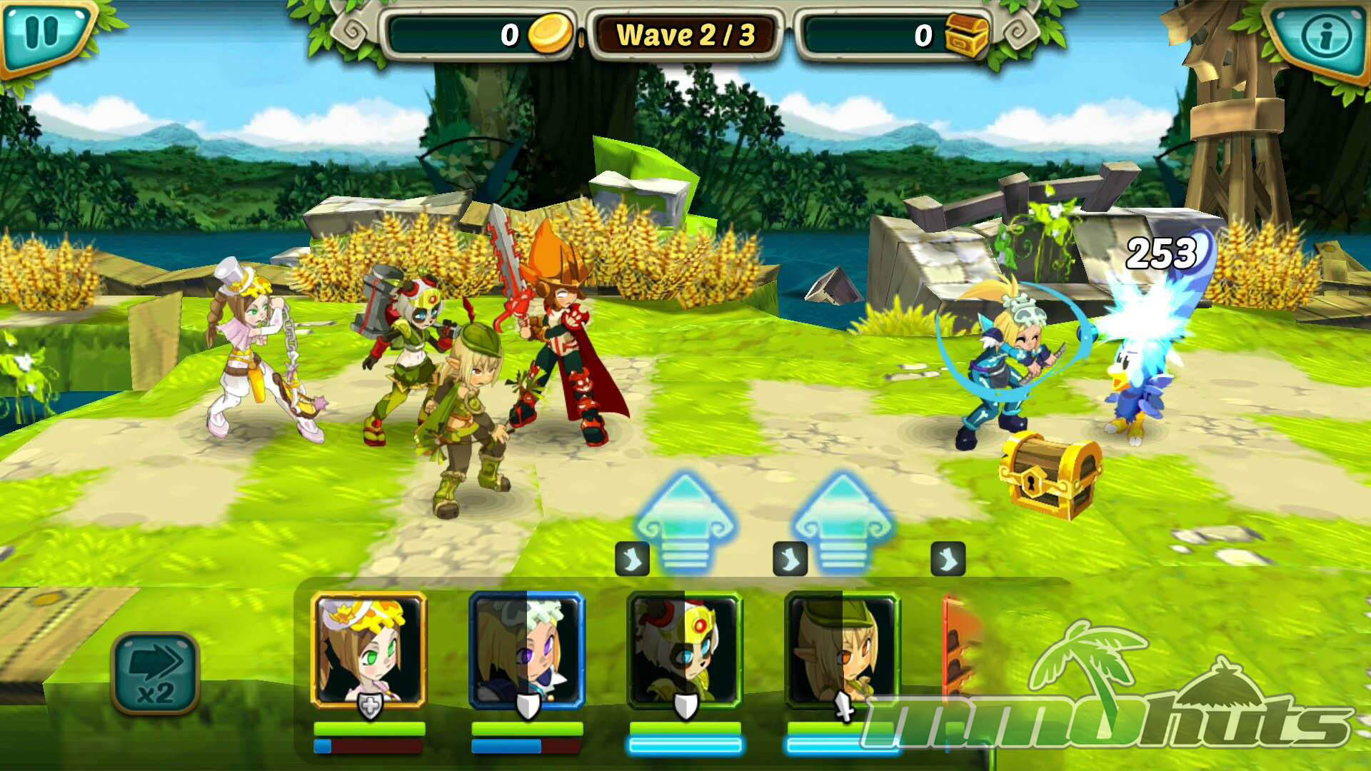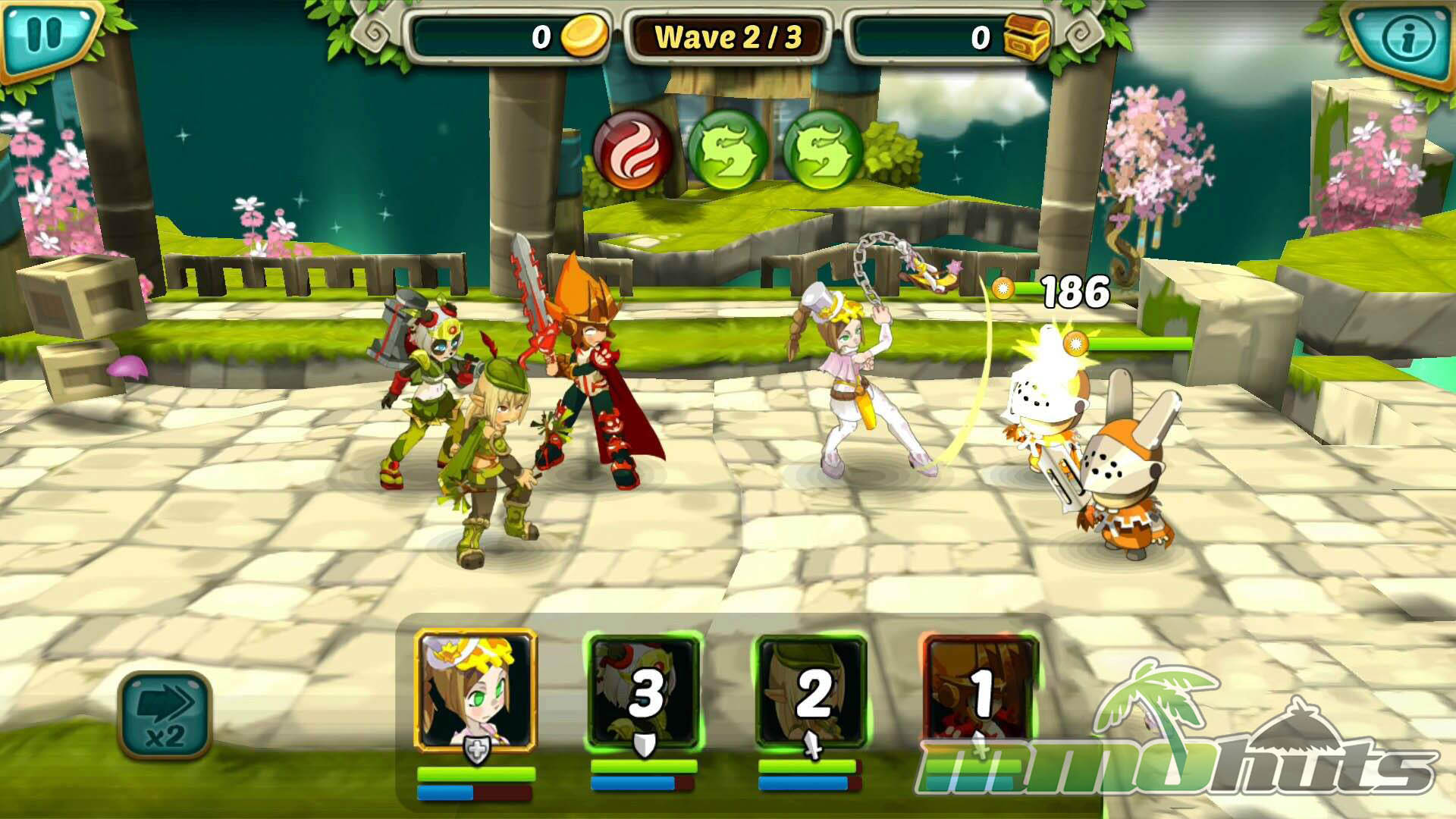 Wakfu Raiders includes over 100 stages spread across different environments with their own enemy sets. Team-building matters, as you field up to five Heroes and place them into a formation that influences their effectiveness. Front positions favor offense, middle slots emphasize defense, and back positions provide more defensive and recovery-oriented benefits, creating a simple but meaningful setup choice before a fight.