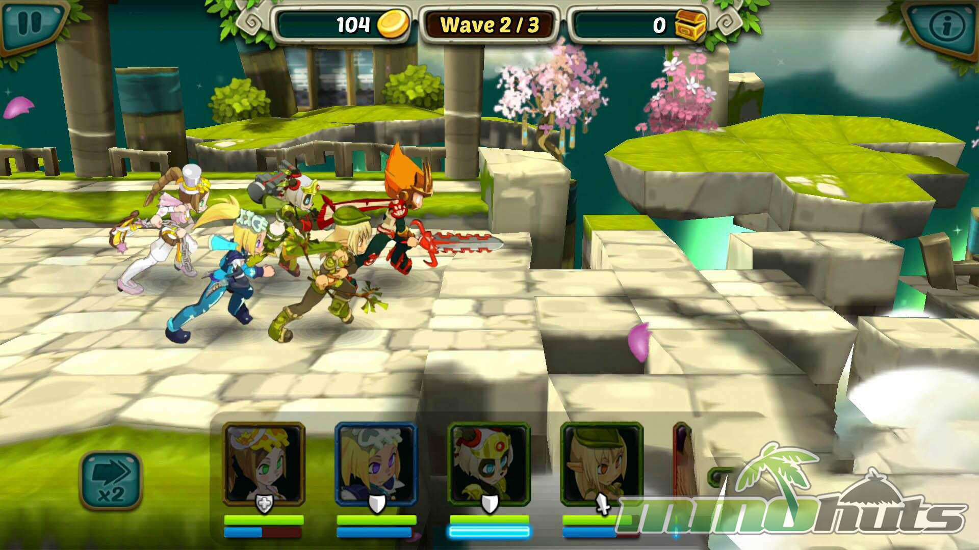 Visually, Wakfu Raiders is its strongest asset. It uses a bright, stylized 2D look that blends whimsical fantasy with touches that feel both Eastern and Western in inspiration, such as serene garden motifs alongside more European-styled towns and gear designs. Characters and environments are drawn with enough depth and staging that the game often reads like a 2.5D side-view experience even though the assets are fundamentally 2D.