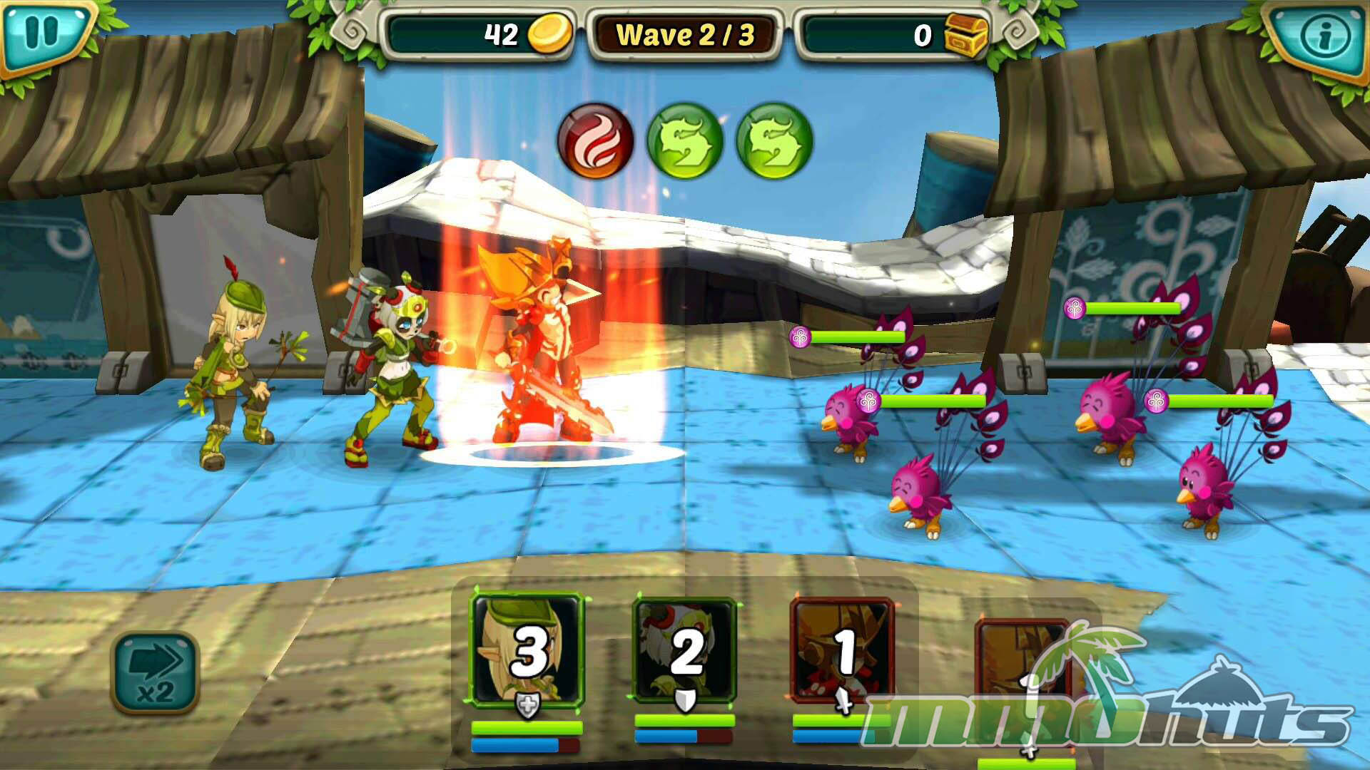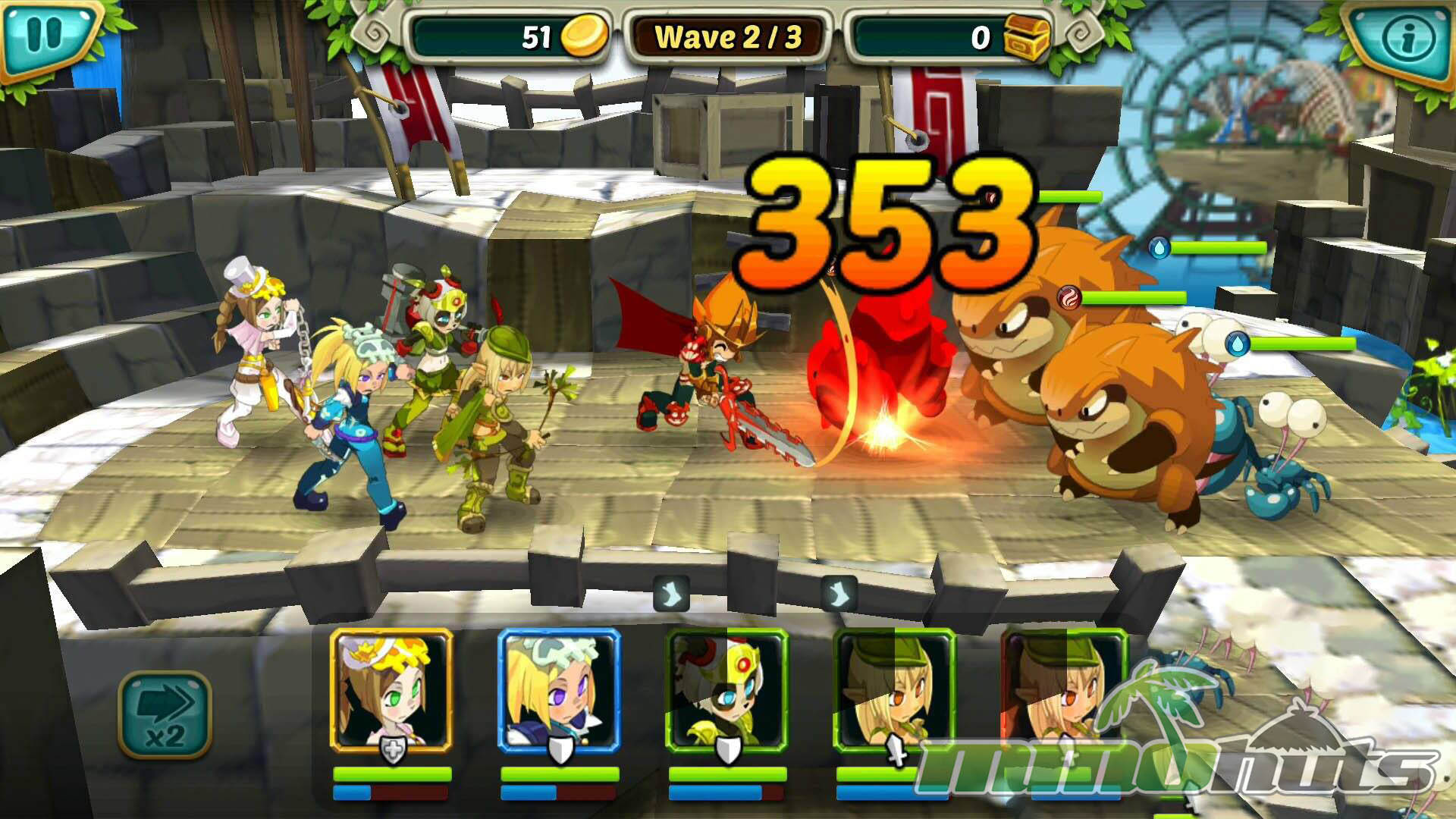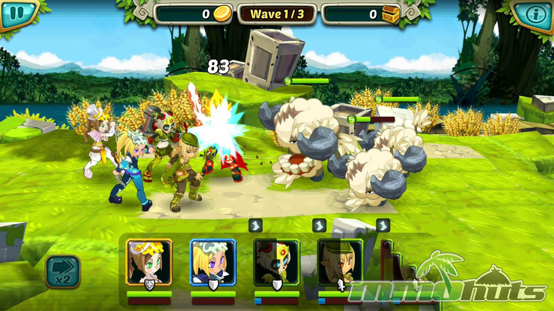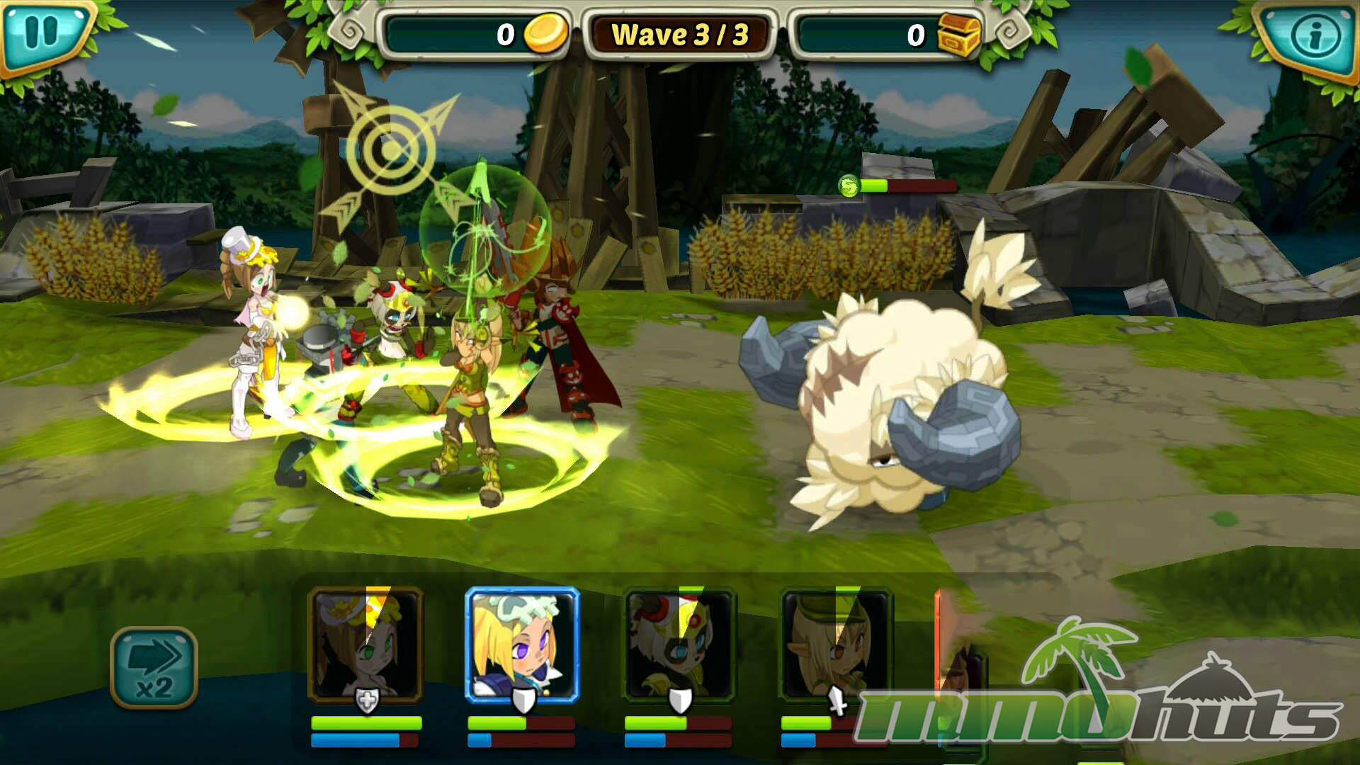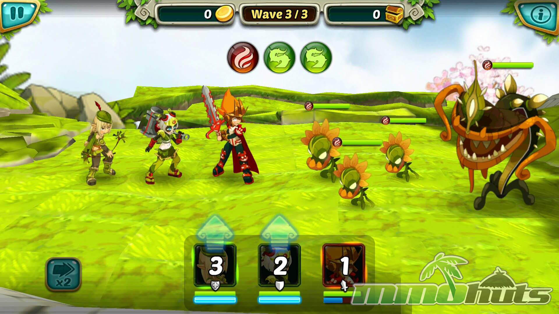 Wakfu Raiders includes over 100 stages spread across different environments with their own enemy sets. Team-building matters, as you field up to five Heroes and place them into a formation that influences their effectiveness. Front positions favor offense, middle slots emphasize defense, and back positions provide more defensive and recovery-oriented benefits, creating a simple but meaningful setup choice before a fight.