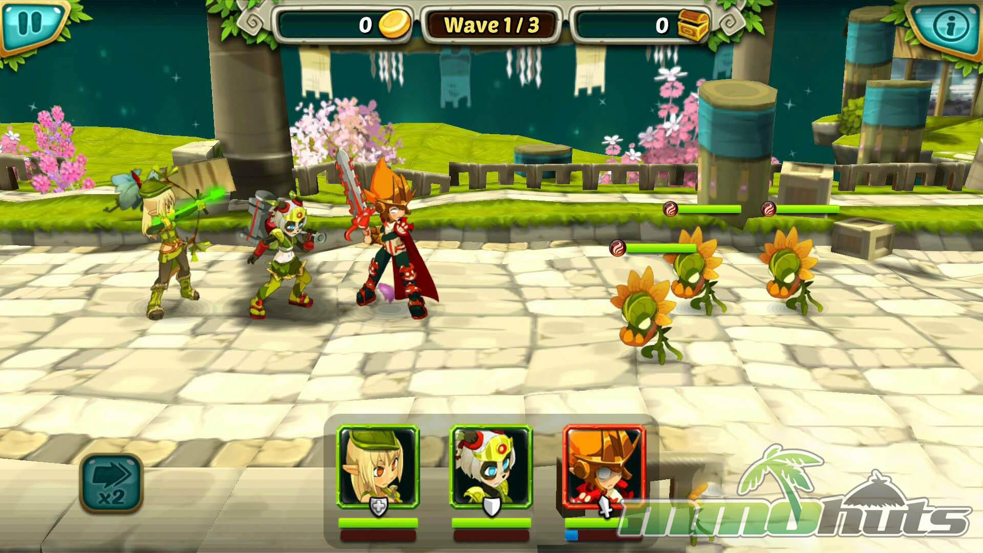 Visually, Wakfu Raiders is its strongest asset. It uses a bright, stylized 2D look that blends whimsical fantasy with touches that feel both Eastern and Western in inspiration, such as serene garden motifs alongside more European-styled towns and gear designs. Characters and environments are drawn with enough depth and staging that the game often reads like a 2.5D side-view experience even though the assets are fundamentally 2D.