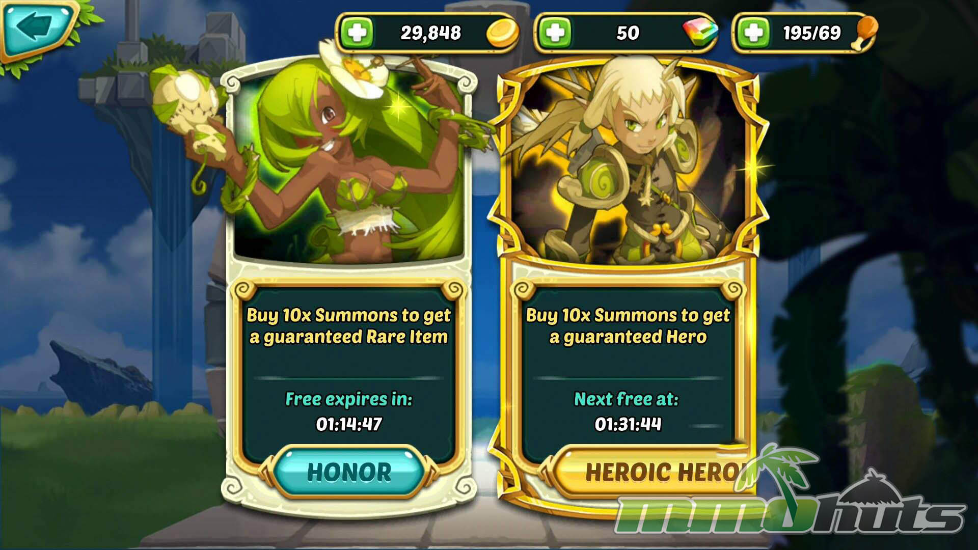 Wakfu Raiders uses a familiar mobile monetization setup centered on the Portal, which is effectively the summoning and purchase hub. Summons are split into Honor and Heroic. Honor Summons use in-game gold and primarily award Hero Soul Shards alongside equipment and upgrade materials. Heroic Summons require Gems and can award full Heroes in addition to other rewards. The game provides one free summon per day for both types, and it also hands out Gems through achievements, quests, and login rewards, which helps free players engage with the system.