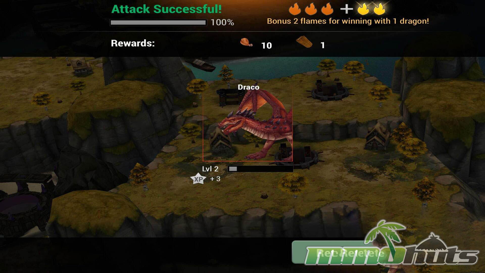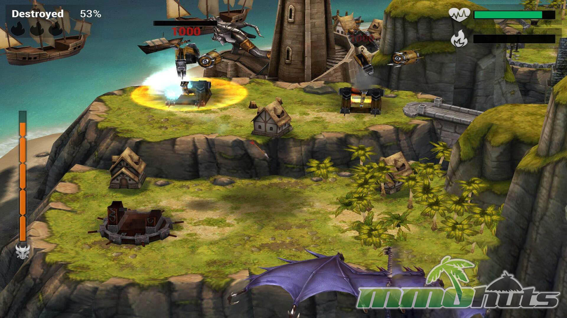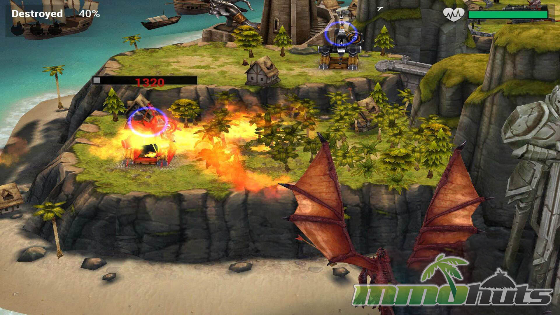 Where it separates itself from many similar strategy games is the offensive side. Instead of sending units and watching a battle play out, you directly pilot a dragon during attacks. Raids unfold as an on-rails flight path over an enemy base where you steer, aim, and trigger abilities to dismantle defenses and push toward full destruction for better rewards. Choosing targets, timing special attacks, and dealing with tower pressure becomes the core moment-to-moment gameplay.