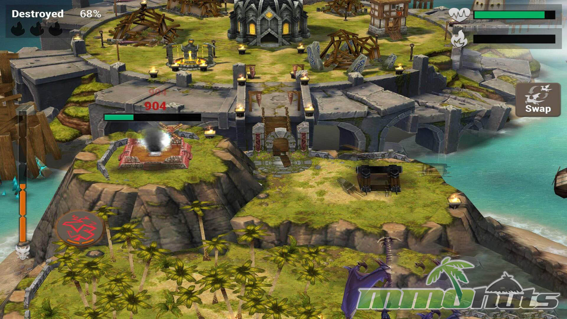 Where it separates itself from many similar strategy games is the offensive side. Instead of sending units and watching a battle play out, you directly pilot a dragon during attacks. Raids unfold as an on-rails flight path over an enemy base where you steer, aim, and trigger abilities to dismantle defenses and push toward full destruction for better rewards. Choosing targets, timing special attacks, and dealing with tower pressure becomes the core moment-to-moment gameplay.