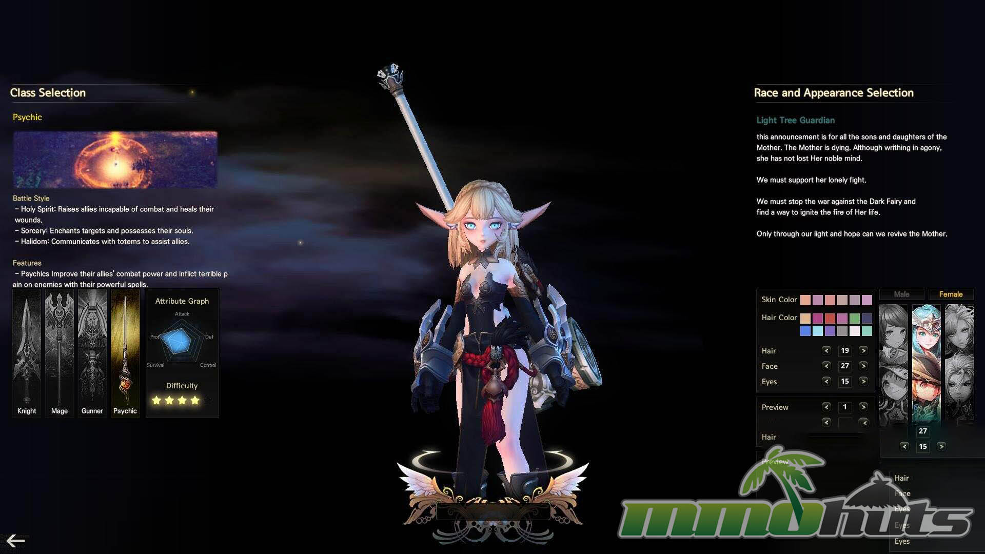 Class selection is straightforward: Knight, Mage, Gunner, and Psychic. Each class is framed with a clear role expectation (durability versus damage focus, for example), but the more important decision is how you prefer to fight, because each class is effectively split into three combat styles through the weapon system. That structure is what gives ELOA its personality, and it is also what makes the classes feel more flexible than their names suggest.