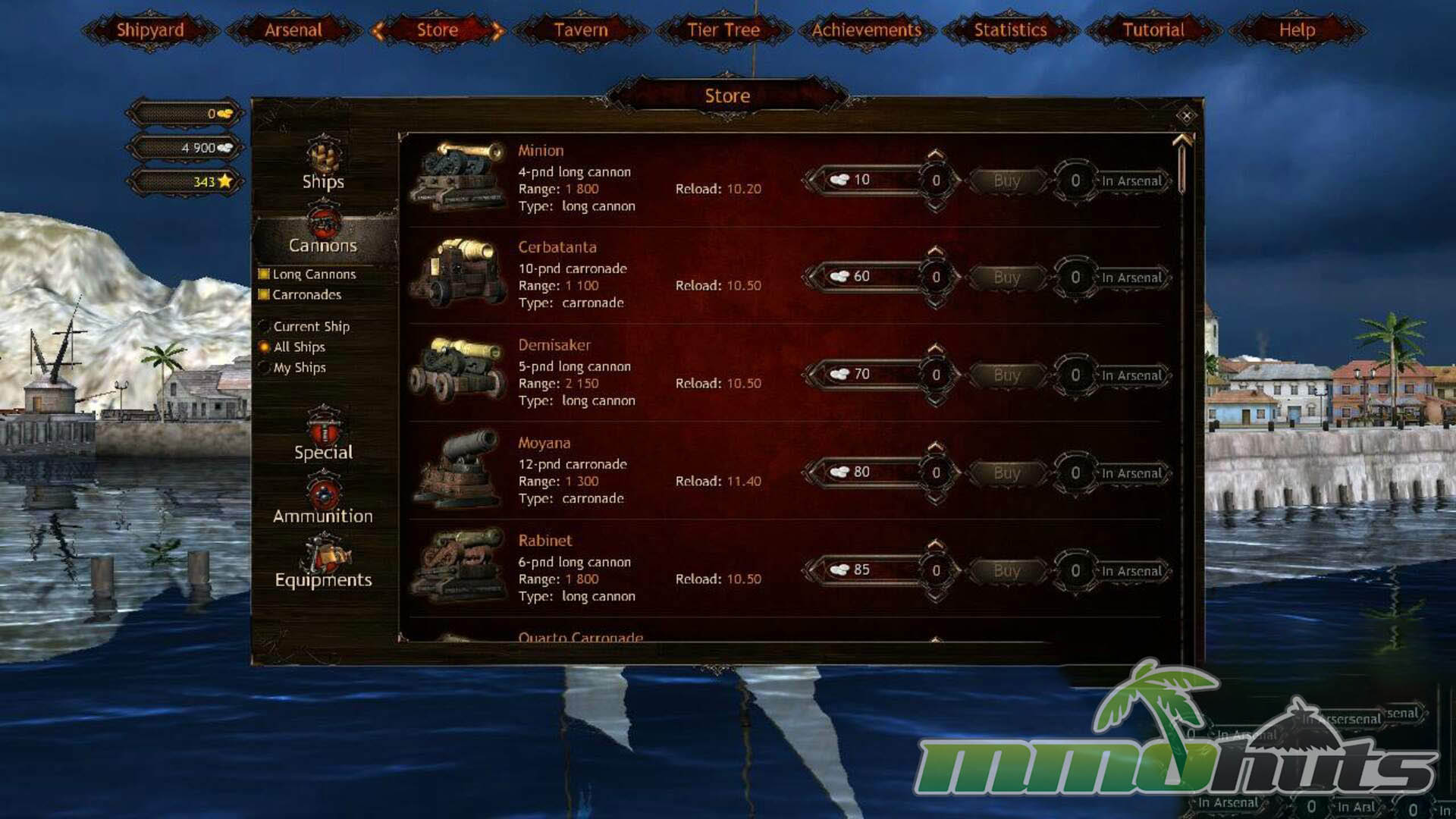 Between battles, most of your time is spent in the Shipyard interface. It is essentially your loadout and progression headquarters, a place to buy weapons, upgrade ships, and hire crew. Menus along the top lead to areas like the Arsenal, Store, Tavern, and the Tier Tree, with your active ship presented front and center as the one you are currently modifying. Swapping to another vessel is done via the ship icons along the bottom of the screen.