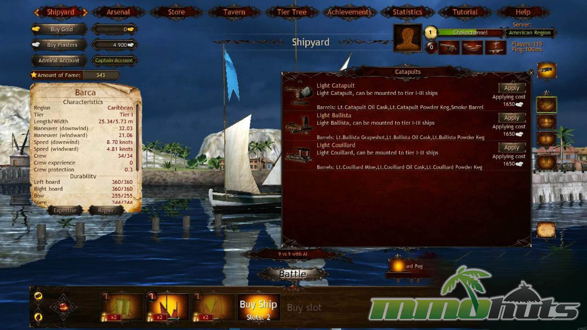 Everyone begins with three Tier I ships, one per style (Asian, Caribbean, and Mediterranean). From there, the game pushes you to specialize. Weapons and upgrades are not all available immediately, because they are tied to your earned resources: fame, expertise, and piasters. Fame is the broader unlock track for ships, expertise opens up tech on the Tier Tree, and piasters are the spending currency. One detail worth noting is that expertise is tracked per ship, so if you want a specific weapon option on a particular vessel (for example, a higher tier Asian ship), you need to play that ship to build the expertise required for that unlock.